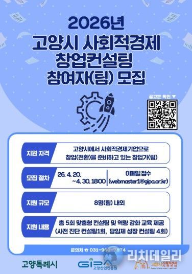 리치데일리 김상현 기자 | 고양산업진흥원이 운영하는 고양시사회적경제지원센터가‘2026년 고양시 사회적경제 창업컨설팅 사업’에 참여할 예비 창업자(팀)을 오는 30일까지 모집한다.