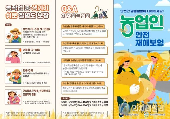 농업인 안전보험은 농작업 중 발생하는 재해와 질병을 보장한다. 온열질환, 쯔쯔가무시병, 중증열성혈소판감소증후군, 근골격계 질환 등이 보장 대상에 포함되며, 사망·장해와 상해·질병 치료도 상품별 기준에 따라 지원된다.