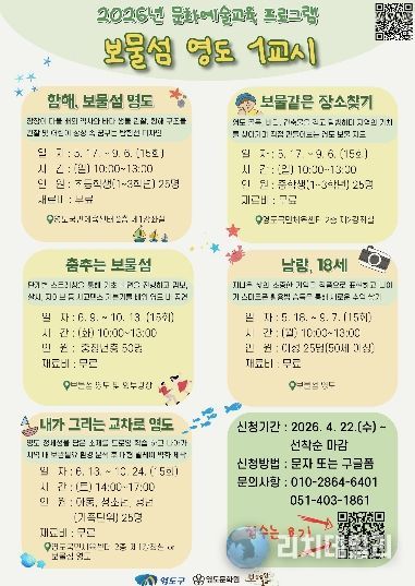 리치데일리 김상현 기자 | 부산시 영도구는 지역 자원을 활용한 영도형 문화예술교육 프로그램인 ‘보물섬영도 1교시’ 참여자를 오는 5월부터 본격 운영한다.
