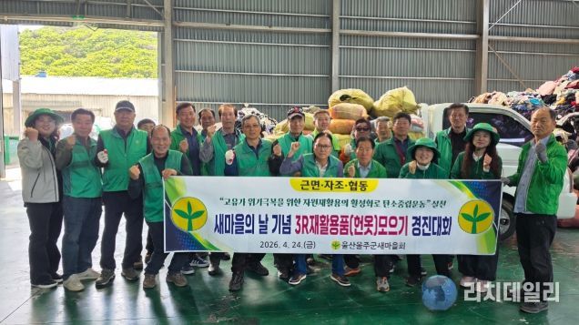 리치데일리 김상현 기자 | 울산울주군새마을회(회장 송병열)가 협의회(회장 양갑규), 부녀회(회장 김옥희), 직장협의회(회장 김학준), 문고회(회장 안정애)와 함께 24일 울산 북구 동남상사에서 고유가 위기 극복을 위한 ‘2026년 상반기 3R 자원재활용 헌 옷 모으기 경진대회’를 개최했다.