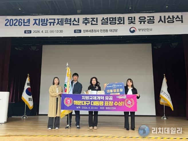 리치데일리 김상현 기자 | 해운대구는 행정안전부 주관‘2025년 지방규제혁신 추진 성과평가’에서 우수한 성과를 인정받아 지난 22일 지방규제개혁 유공 대통령 표창을 수상하였다.