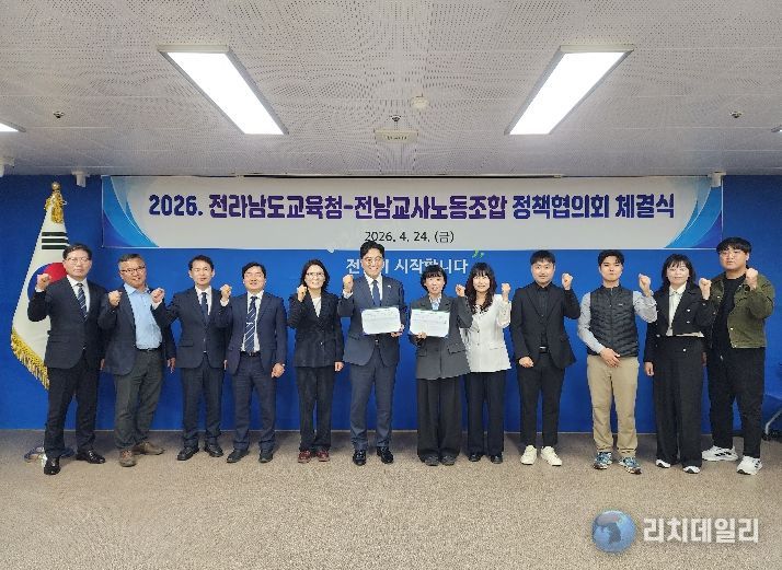리치데일리 김상현 기자 | 전라남도교육청과 전남교사노동조합(위원장 김신안)은 24일 전라남도교육청 중회의실에서 ‘2026년도 정책협의회 체결식’을 갖고, 건강한 교육 생태계 조성을 위한 공동의 노력을 약속했다.