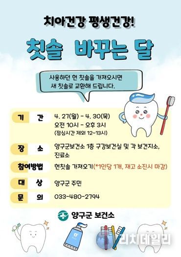 보건소 관계자에 따르면 오래 사용한 칫솔은 탄력이 떨어져 치태 제거 능력이 저하될 뿐만 아니라 세균 번식의 온상이 되어 잇몸 질환의 원인이 될 수 있다. 이에 따라 양구군은 이번 행사를 통해 치아 건강을 지키기 위한 ‘3개월 주기 칫솔 교체’의 필요성을 집중적으로 홍보할 예정이다.