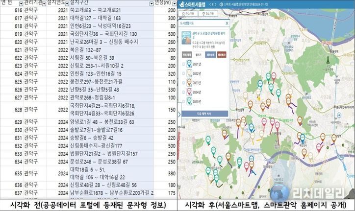 이에 관악구는 개방된 공공데이터와 현장 관리를 위해 내부적으로 작성한 도면 자료를 결합했다. 텍스트와 도면 데이터를 ‘서울스마트맵’상의 공간정보로 정밀하게 전환·구현함으로써, 이제는 누구나 도로열선의 구체적인 위치를 지도상에서 한눈에 확인할 수 있게 됐다.