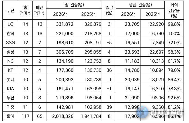 오늘 경기까지 평균 관중은 1만 7,902명으로 지난해 동 경기 수 대비 약 8% 증가했다.
