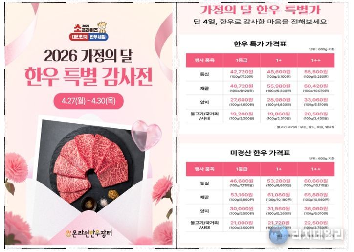 또한, 이번 할인행사에 참여한 업체별로 부위와 등급에 따라 할인가격은 상이하나, 정상가격과 비교하면 최대 50%까지 인하된 가격으로 판매된다.특히, 캠핑 등 야외할동이 많은 점을 고려하여 등심의 경우 설명절 할인행사(1등급 기준 100g당 7,870원)보다 약 9% 인하된 100g당 7,160원에 판매된다.