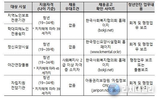 이번 모집을 통해 선발되는 479명의 청년인턴은 전국 아동·노인·정신요양 시설 등 5개 유형의 시설에서 근무하게 된다.