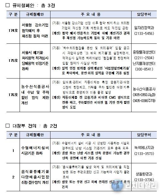 시는 자체적으로 개선 가능한 ▴서울형 강소기업 협약해지 후 재신청 절차 마련(174호) ▴서울시 폐기물 처리용역 적격심사 당해용역 인정기준 완화(175호) ▴농수산식품공사 내 수납 및 주차할인 방식 제한 개선(176호) 과제는 정비하고, ▴수열에너지 설비 시공기준 완화, ▴음식물류폐기물 다량배출사업장 신청․접수방식 개선 등 2건은 정부에 공식 건의했다.
