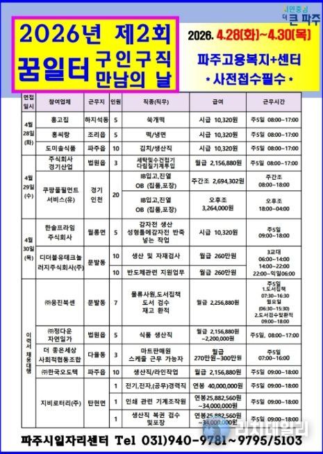 리치데일리 김상현 기자 | 파주시는 오는 28일부터 30일까지 파주고용복지플러스센터(금촌동 엠에이치(MH)타워 8층)에서 2026년 제2회 ‘구인·구직 만남의 날’을 개최한다.