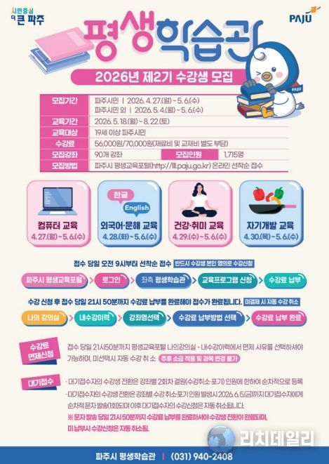 리치데일리 김상현 기자 | 파주시 평생학습관은 시민의 평생학습 기회를 확대하기 위해 '2026년 제2기 정규강좌’수강생을 오는 4월 27일부터 5월 6일까지 모집한다.