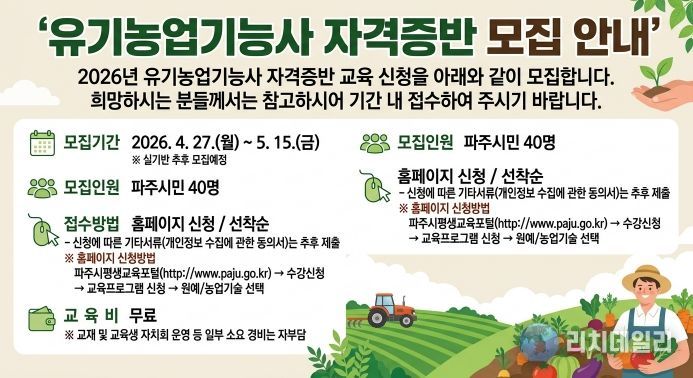 리치데일리 김상현 기자 | 파주시농업기술센터는 친환경농업 분야 농업 전문 인력 육성을 위한 '2026년 유기농업기능사 자격증 취득’교육생을 4월 27일부터 5월 15일까지 모집한다.