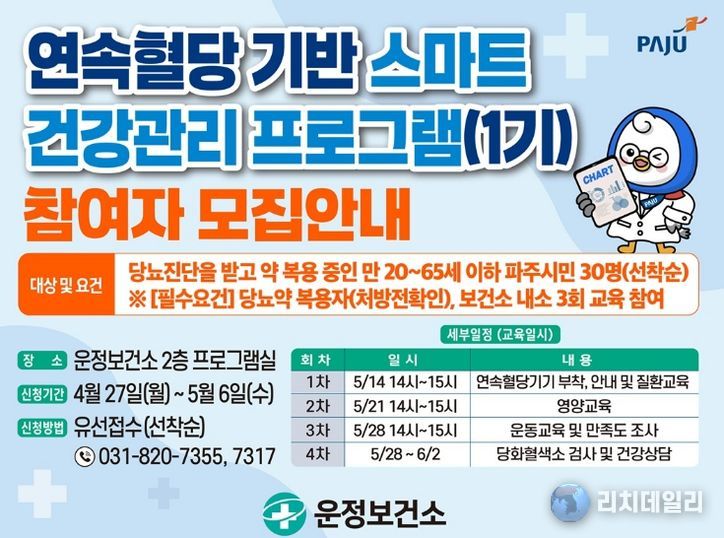 리치데일리 김상현 기자 | 파주시 운정보건소는 심뇌혈관질환 예방관리사업의 일환으로 ‘연속혈당 기반 스마트 건강관리 프로그램’참여자를 오는 27일부터 10일간 모집한다.