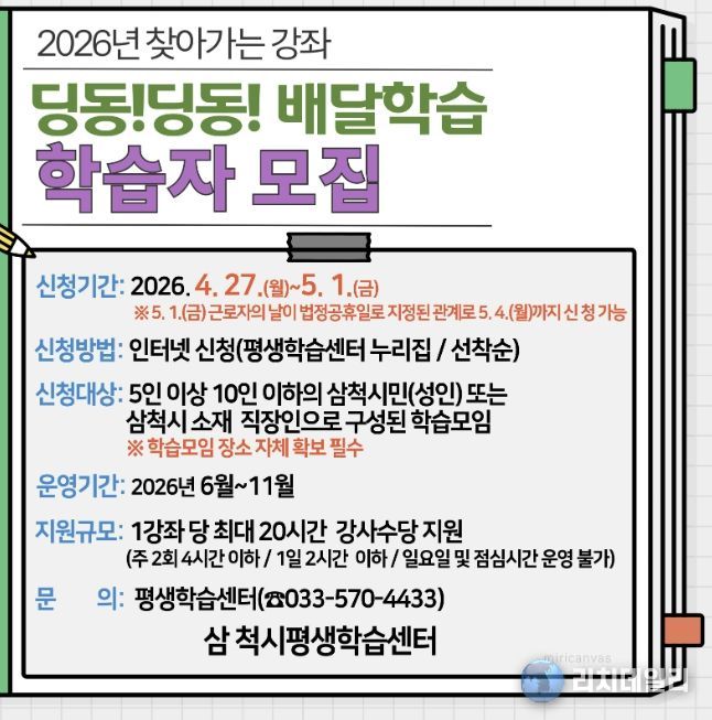 리치데일리 김상현 기자 | 삼척시는 4월 27일부터 5월 4일까지 ‘2026년 찾아가는 강좌 '딩동! 딩동! 배달학습'’ 참여 학습자를 모집한다고 밝혔다.