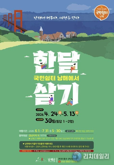 남해군 ‘국민쉼터 남해에서 한 달 살기’는 경남 이외에 거주하는 만19세 이상 국민이면 누구나 참여 가능하며, 자세한 사항은 남해군 홈페이지 공고에서 확인할 수 있다. 남해군 관광진흥과장은 “2026년은 남해군이 체류형 관광지로 한 단계 도약하는 해가 될 것”이라며, “국민쉼터 남해에서 한 달 살기를 통해 더 많은 분들이 남해군의 매력을 깊이 경험하고, 남해와 특별한 인연을 맺는 계기가 됐으면 한다. 앞으로도 남해군을 다시 찾고 싶은 ‘국민고향’으로 만들기 위해 최선을 다하겠다.”고 밝혔다.