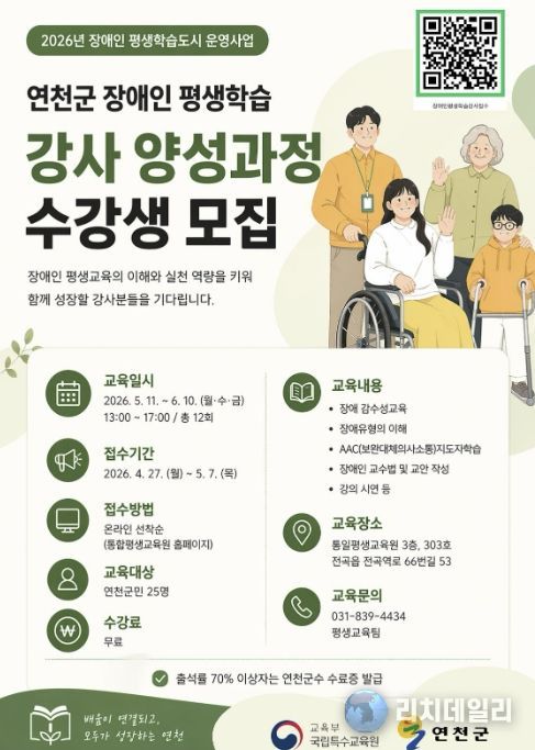 리치데일리 김상현 기자 | 연천군은 교육부 국립특수교육원이 주관하는 '2026년 장애인 평생학습도시 운영 지원사업' 공모에 선정됨에 따라 장애인 평생교육 현장형 강사 양성 과정을 운영한다.