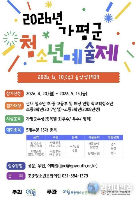 가평군 관계자는 “이번 ‘2026년 가평군청소년예술제’가 청소년들이 자신의 꿈과 재능을 발견하고 성장하는 소중한 기회가 되길 바란다”며 “지역 청소년들이 적극적으로 참여해 예술적 끼와 재능을 마음껏 펼치길 기대한다”고 말했다.