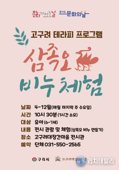 리치데일리 김상현 기자 | 구리시는 4월부터 고구려대장간마을에서 매월 마지막 주 수요일 ‘문화가 있는 날’을 맞아 ‘삼족오 비누 체험! 고구려 치료 프로그램’을 운영한다고 밝혔다.