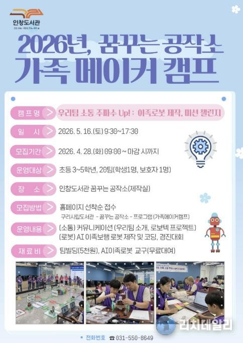 리치데일리 김상현 기자 | 구리시 인창도서관‘꿈꾸는 공작소’는 오는 5월 16일 초등학생 자녀와 보호자가 함께 참여해 가족 간 유대감을 높이고 인공지능을 체험하는 '우리 팀 소통 주파수 Up! : 이족로봇 제작, 미션 챌린지' 가족 메이커 캠프를 운영한다고 밝혔다.