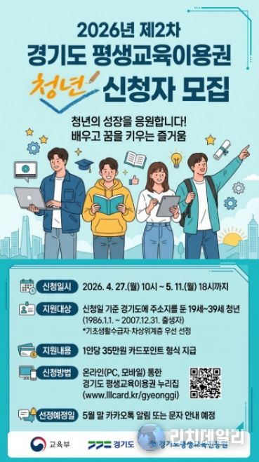 이번 사업은 경제적 여건과 관계없이 학습 참여를 지원하는 평생교육 이용권으로, 신청대상자는 경기도에 주민등록상 주소를 둔 19~39세 청년이며, 선정 시 1인당 35만 원의 교육비(수강료 및 교재비)를 지원받는다.