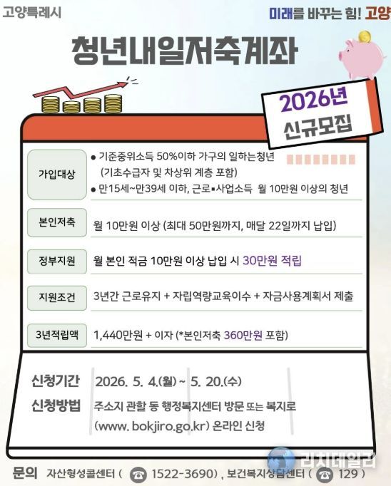 리치데일리 김상현 기자 | 고양특례시는 5월 4일부터 시작하는 청년내일저축계좌 신규 가입자 모집을 앞두고, 가입 독려에 나섰다.