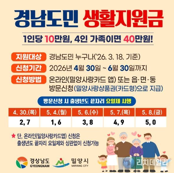 리치데일리 김상현 기자 | 경남 밀양시는 오는 4월 30일부터 시민 생활 안정을 지원하기 위한 ‘경남도민 생활지원금’ 신청을 받는다고 밝혔다.