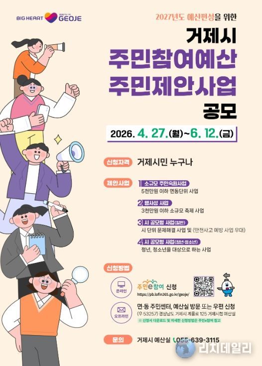 리치데일리 김상현 기자 | 거제시는 2027년도 본예산 편성을 앞두고 재정운용의 투명성과 시민에게 공감받는 예산편성을 실현하고자 오는 6월 12일까지‘주민참여예산 제안사업 공모’를 실시한다.