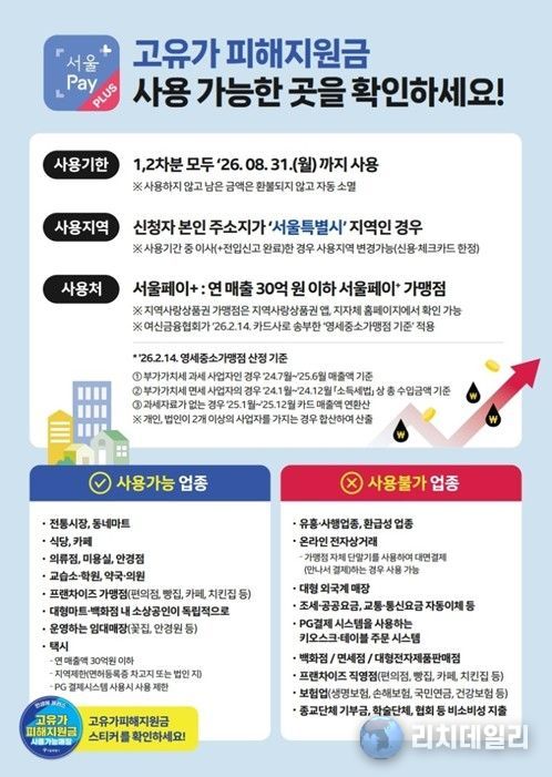 지원금은 행정안전부 지침에 따라 2026년 8월 31일까지 서울 소재 연매출 30억 원 이하 가맹점에서 사용 가능하고, 기한 내 사용하지 못한 잔액은 자동 회수된다. 또한 서울사랑상품권으로 지급된 지원금은 기존 상품권과 달리 ‘선물하기’ 기능은 제한된다.