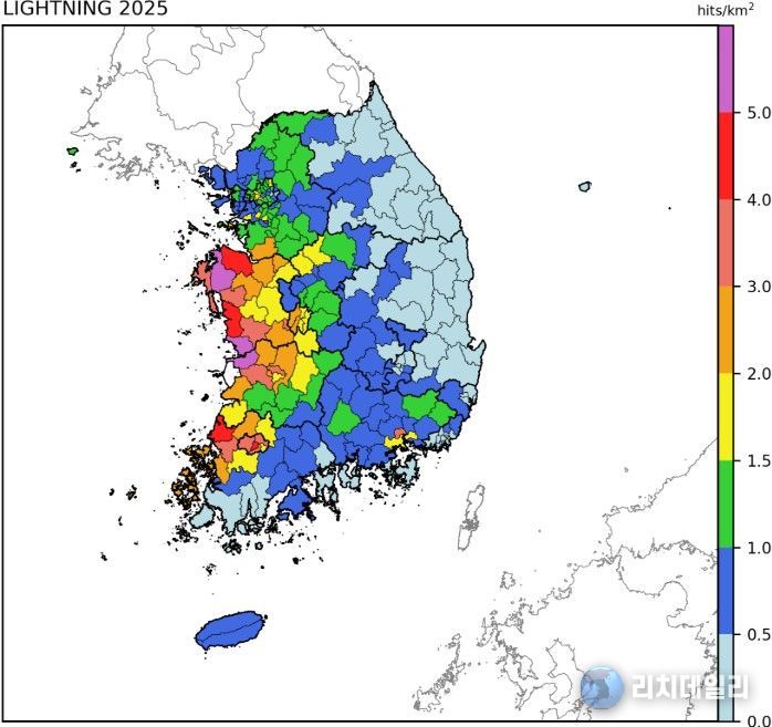 리치데일리 김상현 기자 | 기상청은 2025년 우리나라에서 관측된 낙뢰 정보를 담은 ‘2025 낙뢰연보’를 발간했다. 연보는 기상청 21개 낙뢰 관측망으로 관측한 자료를 통해 분석한 △월별, 광역시·도별, 시군구별 낙뢰 횟수 △단위 면적당(㎢) 횟수 △낙뢰 공간 분포 △주요 5대 낙뢰 사례 등의 내용을 담고 있다.
