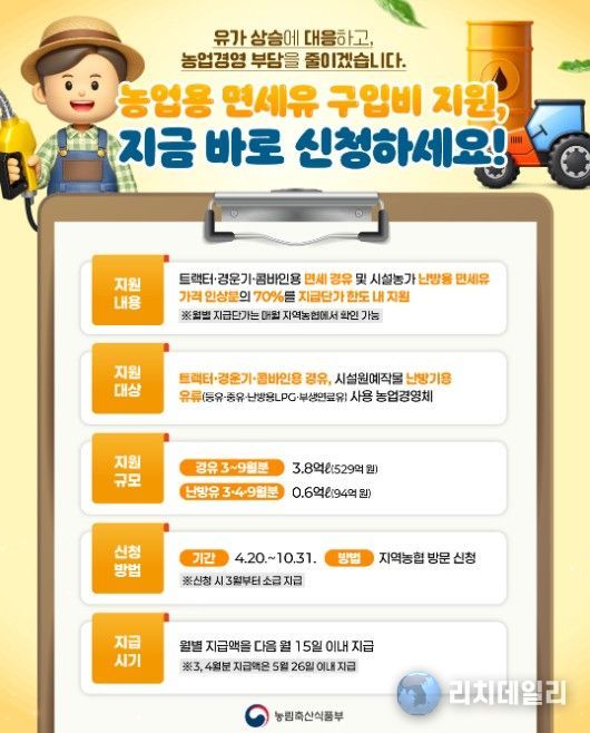 리치데일리 김상현 기자 | 농림축산식품부는 올해 추경예산에 반영된 농기계 3종 면세경유 유가연동보조금과 시설농가 난방용 면세유 유가연동보조금 지원 신청·접수중(4월 20일~10월 31일)에 있다고 밝혔다.