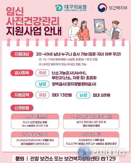 리치데일리 김상현 기자 | 대구의료원 난임센터는 임신·출산에 장애가 될 수 있는 건강 위험요인을 조기에 발견하기 위한 ‘임신 사전건강관리 지원사업’ 참여의료기관으로 선정돼, 지역 주민의 건강한 임신·출산 환경 조성을 적극 지원한다.