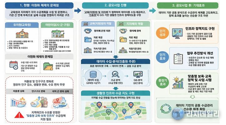 리치데일리 김상현 기자 | 교육부와 한국보육진흥원(원장 조용남)은 모든 영유아가 집 근처에서 질 높은 교육·보육 서비스를 받을 수 있도록 유치원과 어린이집 수급 정보를 한 곳에서 분석·제공하는 ‘영유아 교육·보육 인프라 데이터 체계 구축 시범지역 공모’를 실시한다.