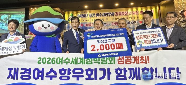 리치데일리 김상현 기자 | (재)2026여수세계섬박람회조직위원회는 지난 26일 재경여수향우회 회장 이취임식에서 향우회와 2,200만 원 상당의 입장권 구매약정을 체결했다.