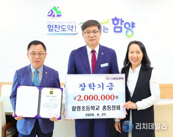 리치데일리 김상현 기자 | (재)함양군장학회는 4월 27일 팔령초등학교 총동창회(회장 박갑열)가 지역 인재 육성을 위한 장학금 200만 원을 기탁했다고 밝혔다.