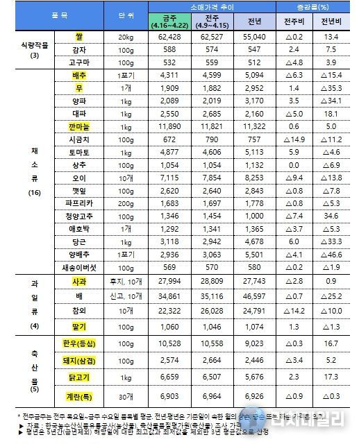 리치데일리 김상현 기자 | 농림축산식품부는 4월 5주 수급동향 점검 결과, 지난주와 특별한 변동 없이 농산물 가격은 전반적으로 전년 대비 낮은 수준을 유지하고 있는 것으로 나타났다고 밝혔다.