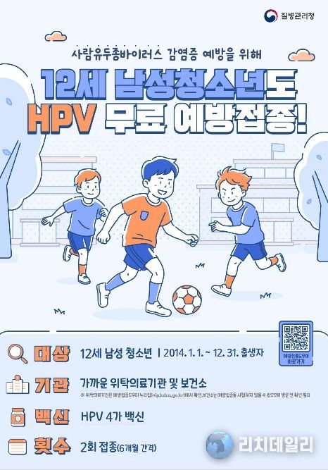 이번 사업은 오는 5월 6일부터 시행된다. 지원 대상은 2026년 기준 2014년생 남아(12세)로, HPV 백신(HPV4가)을 6개월 간격으로 총 2회 무료 접종받을 수 있다.