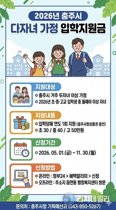 리치데일리 김상현 기자 | 충주시는 다자녀 가정의 경제적 부담을 완화하고 안정적인 양육 환경을 조성하기 위해 2026학년도 초·중·고등학교에 입학하는 둘째 자녀 이상에게 입학지원금을 지원한다고 밝혔다.