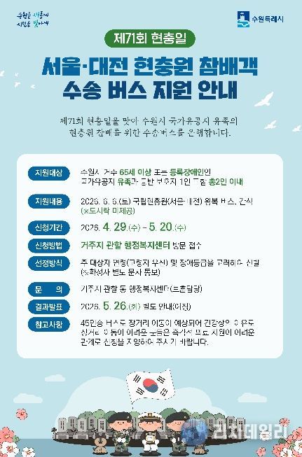 리치데일리 김상현 기자 | 수원특례시가 제71회 현충일인 6월 6일, 국립현충원(서울·대전)까지 이동이 여의치 않은 국가유공자 유족을 위해 현충원 왕복 수송버스를 운행한다.