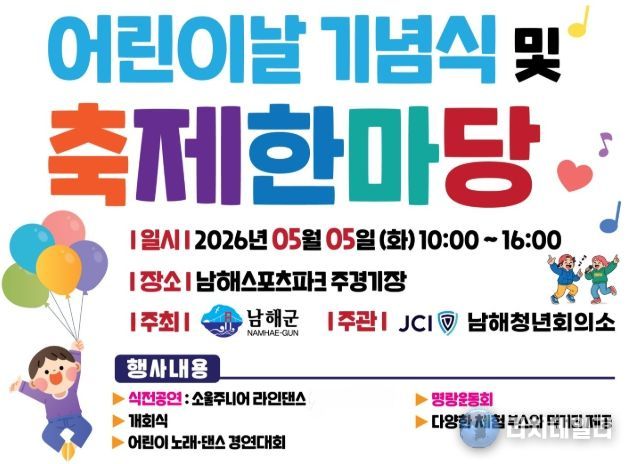 리치데일리 김상현 기자 | 남해군은 5월 5일 어린이날을 맞아 ‘제104회 어린이날 기념식 및 축제한마당’을 남해스포츠파크 주경기장에서 개최한다.