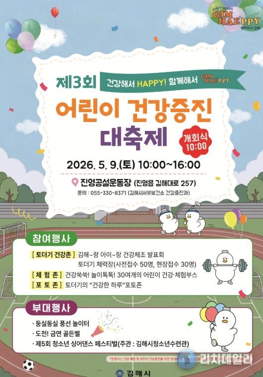 리치데일리 김상현 기자 | 김해시서부보건소는 오는 5월 9일 진영공설운동장에서 관내 영유아와 초등학생, 가족 등 2,000여 명을 대상으로 ‘제3회 어린이 건강증진대축제’를 개최한다고 밝혔다.