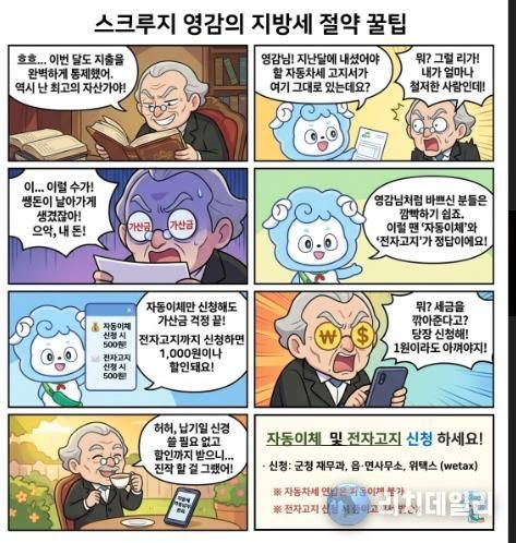 리치데일리 김상현 기자 | 청양군이 스마트폰 환경에 익숙한 군민들을 위해 친숙한 캐릭터를 활용한 웹툰 ‘스크루지 영감의 지방세 절세 꿀팁’을 제작하고, 자동이체 및 전자고지 신청 독려에 나섰다.
