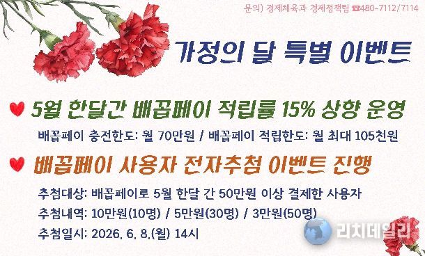 이미숙 경제체육과장은 “가정의 달을 맞아 추진하는 이번 특별이벤트가 지역 내 소비를 촉진하고, 소상공인과 자영업자의 매출 증대는 물론 지역경제 활성화에도 기여할 것으로 기대한다”고 말했다.