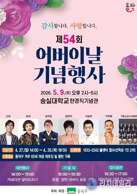 리치데일리 김상현 기자 | 동작구가 오는 5월 9일 오후 2시 숭실대학교 한경직기념관에서 ‘제54회 어버이날 기념행사’를 개최한다고 밝혔다.