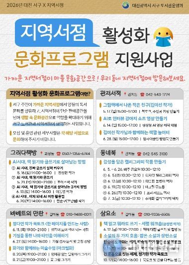관내 5개 서점은 5월부터 특색을 살린 프로그램을 운영한다. △관저서적 ‘그림책에서 나온 작은 친구’ △그리다책방 ‘AI시대, 책 읽기와 글쓰기로 살아남는 방법’ △동네북 ‘감성을 담은 캘리그라피’ △바베트의만찬 ‘기질을 통한 나와 타인을 이해하기’ △삼요소 ‘소설의 두 가지 호흡’ 등이다.