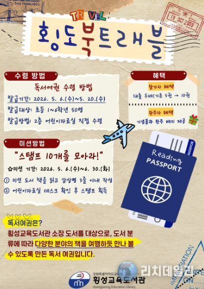 리치데일리 김상현 기자 | 횡성교육도서관은 5월 6일부터 6월 30일까지 어린이들의 자발적인 독서 습관 형성과 도서관 이용 활성화를 위해 독서 여권을 활용한 ‘횡도북트래블’ 프로그램을 운영한다고 밝혔다.