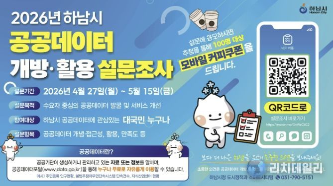 리치데일리 김상현 기자 | 하남시는 시민과 기업, 연구기관 등 다양한 수요자의 의견을 반영해 공공데이터 개방 및 활용을 확대하고자 ‘2026년 하남시 공공데이터 설문조사’를 실시한다고 밝혔다.