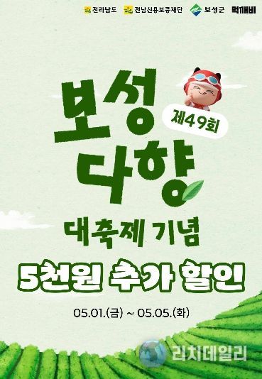 리치데일리 김상현 기자 | 보성군은 제49회 보성다향대축제를 맞아 5월 1일부터 5일간 공공배달앱 ‘먹깨비’를 활용한 추가 할인 행사를 진행한다고 밝혔다.