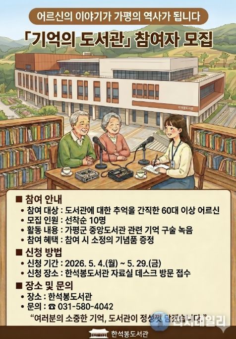 도서관은 오는 5월 4일부터 29일까지 가평군 중앙도서관과 관련된 추억을 간직한 60대 이상 어르신 10명을 선착순으로 모집한다. 참여를 희망하는 어르신은 한석봉도서관 자료실 데스크를 방문해 신청할 수 있으며, 참여 시 소정의 기념품이 제공된다.