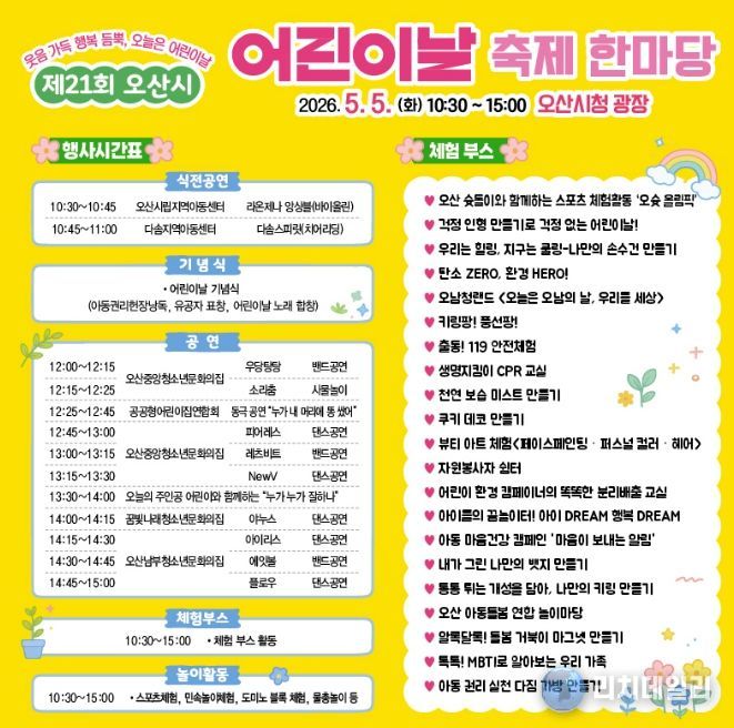 행사장에서는 오산시립지역아동센터 라온제나 앙상블과 다솜지역아동센터 다솜스피릿의 식전 공연을 시작으로 어린이날 기념식이 열린다. 이어 아동권리다짐 가방 만들기, 키링 만들기, 쿠키 만들기 등 다양한 체험부스가 운영된다.