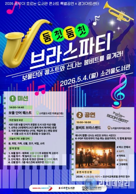 리치데일리 김상현 기자 | 오산시 소리울도서관은 제104회 어린이날을 앞둔 오는 5월 4일 경기아트센터와 협업해 ‘2026 음악이 흐르는 도서관 콘서트’ 특별공연인 ‘둠칫둠칫 브라스 파티’를 개최한다고 밝혔다.