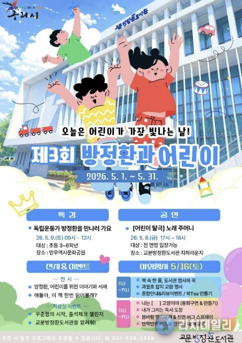 행사 기간에는 상설 행사와 전시도 함께 운영된다. 도서관 방문 임무 행사인 ▲꾸준함의 시작, 출석 점검 도전 잇기 ▲교문방정환도서관을 알려주세요! 등에 참여하면 다양한 혜택을 받을 수 있다. 아울러 ‘방정환 어린이를 위한 이야기와 서재’를 주제로 기념 전시가 열리며, 어린이를 위한 특별 도서 추천도 함께 진행될 예정이다.